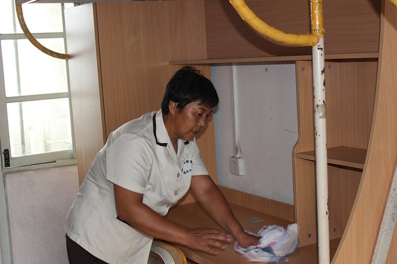 暑假期间,学生区物业管理中心为了做好迎新工作,组织人员对新生居住的宿舍进行了全面的保洁,楼内保洁员加班加点工作,确保新生宿舍按期整理完毕,让新生温馨入住。 图为清洁工朱桂兰在抹家具。文/图: 集团党办