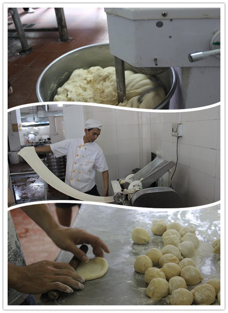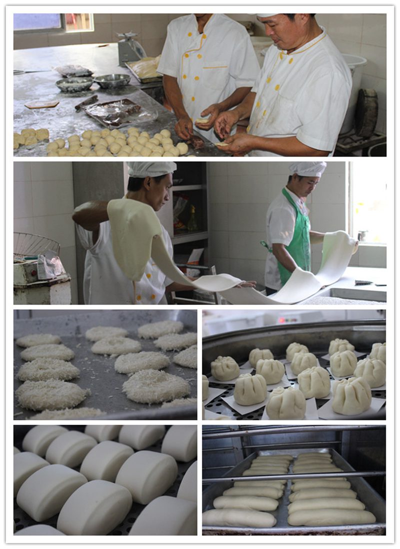 据加工部负责人黄炬介绍,每天凌晨三四点的时候,房子里面灯火通明,到处都看到面点师傅们烤面包,炸油条,蒸包子的忙碌身影,一切都在井然有序的进行当中。在面包房里,有很多面包已经烤好,放置在饼架上,一个个烤盘里金黄金黄的面包不时散发着一股股奶油的香味,心里激动无比。师傅告诉我,面包、蛋糕等糕点基本已经生产完了,都已经分配到各食堂去销售了,油条、芋头包等煎炸类的面点也正在赶制中。