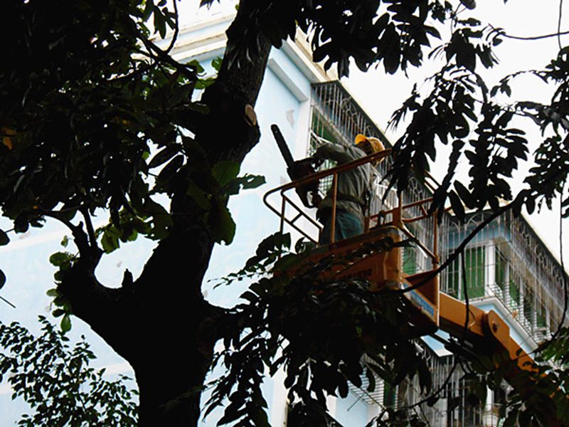 11月15日,校园服务中心工作人员对教工住宅枯死的大叶榄仁进行砍伐,近20米高的枯树锯断,清除了由于枯死树腐烂折断而带来的安全隐患。