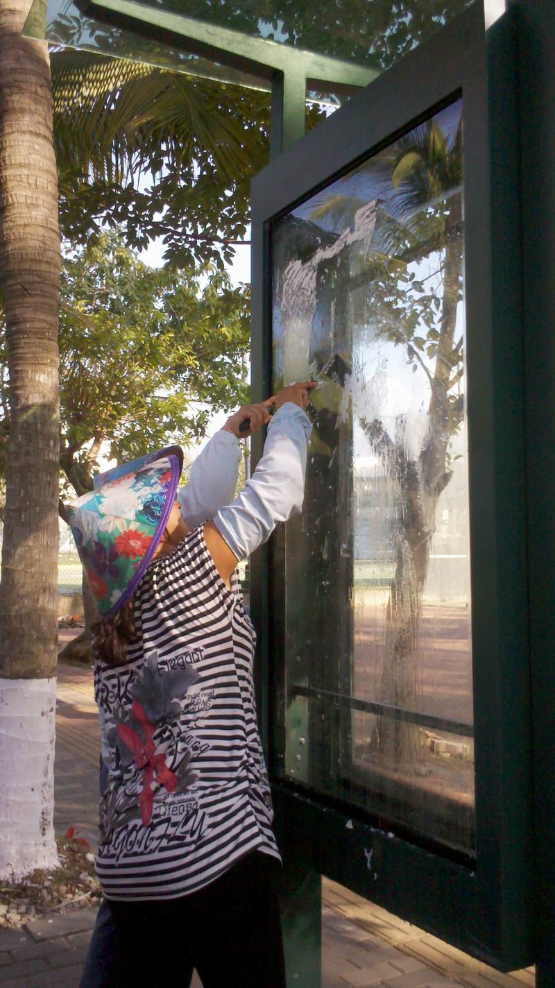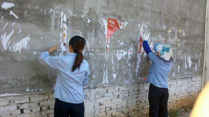 在清理工作前,工作人员已准备好了铲刀、刷子、水桶、湿布等工具,经过精心安排后,清理工作便如火如荼地开展起来。由于很多小广告张贴时间较久且张贴时使用了双面胶,清理起来十分不便。在不损坏建筑墙面的前提下,工作人员想尽一切办法,直接清理不掉的就用手指甲一点一点地刮。活动中大家不怕脏,不喊累,经过两个多小时的努力,彻底完成了清理工作,所清理区域的公交站牌、围墙等恢复如新。