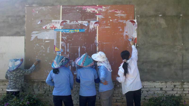 为了以优美的校园环境迎接“创建省级卫生先进单位”的考核验收, 10月21日下午,校园服务中心员工在邓培副主任的带领下,对贴粘在校园内东坡像至中门的围墙、紫荆学生公寓楼门口围墙以及校园公交站牌等地方的乱张贴的小广告进行清理。