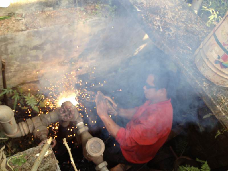 抢修现场,一边是工作人员打电话给水厂紧急停水,一边是抢修人员清理管道坑内的积水。积水很快清理完毕后,避免了管道坑内的污水倒灌回自来水管内再造成污染。同时,水电服务中心的工作人员跳进满是黑泥的管道坑内,对爆裂处进行处理。由于爆裂处位于管道的内侧,爆裂接近300mm,对整个抢修工作带来一定难度。经过七个小时的抢修,在下午六点儋州校区恢复正常供水。