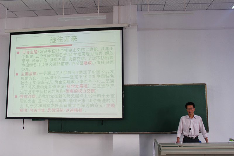 讲座上,范士陈教授做了题为《领会精神 坚定信念——深入学习贯彻党的十八大精神》的专题讲座。授课中,范士陈教授以生动的语言和深入浅出的讲解方式,围绕继往开来、精神解读、精神贯彻三大方面对党的十八大精神进行了准确细致、深入透彻、全面系统的解读,从旗帜高举、科学发展、五位一体、核心价值、纯洁党建、依法治国、亲民务实、成果共享、收入倍增、全面小康、共同发展等方面对十八大精神做了全方位、多角度的解析,深刻的讲解。整场讲座重点突出,逻辑严谨,论述精辟,内容丰富,具有很强的指导性和针对性。