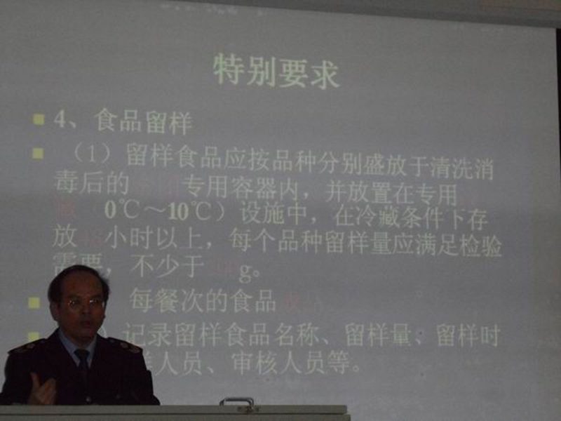 欧兴吉科长作了题为《学校食堂食品安全基本要求》的讲座。他把基本要求分为硬件和软件两个部分来展开讲授。他首先从食堂的合理布局,齐全功能等讲解了硬件部分。接着,从食堂安全管理制度,餐具清洗消毒保洁、采购索证索票、进货查验台账记录、从业人员健康管理、环境卫生管理、生熟食品管理、食品留样管理等对软件部分一一重点展开讲解。欧兴吉科长还多次强调作为高校食堂不能生产凉拌菜,希望各食堂认真遵守。