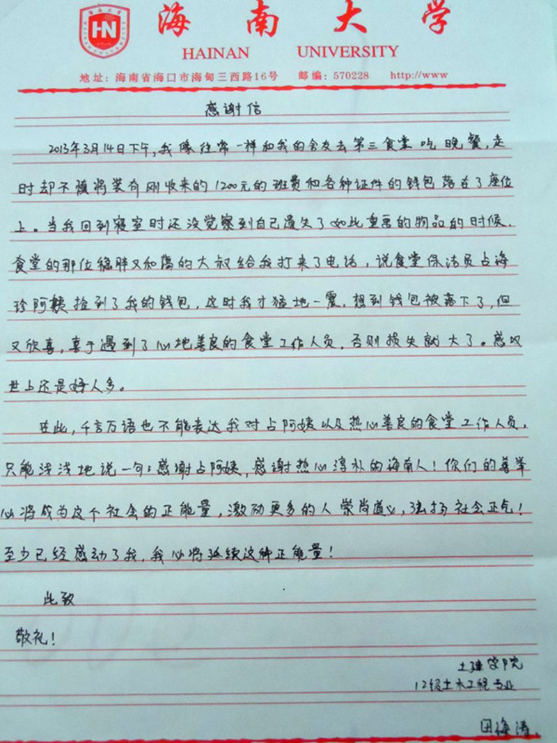 占海珍拾金不昧的精神令田同学非常感动,他没想到一个食堂服务员在捡到上千元现金时第一反应竟然不是占为己有,而是赶紧联系失主,在当今社会这样的人已经很少见了,这让他非常感动,他在临走时还称要写感谢信来夸奖第三食堂员工拾金不昧的好精神。