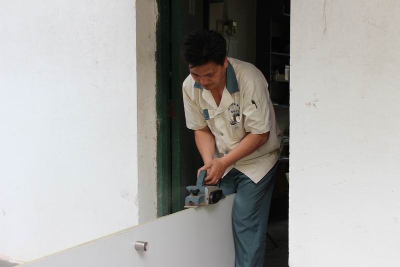 3月22日上午,工程中心木工班班长罗军成接到报修电话,称学校办公楼三楼的卫生间门页损坏了,急需维修。罗师傅马上准备工具出发。到达现场后经仔细查看,心里已经有了维修方案,可是让罗师傅纳闷的是,虽然在现场维修,既方便又省力,但是同时也会因维修机器发出的一些噪音影响到整层楼工作人员的办公。在这犹豫不决的时候,罗师傅断然做出一个决定——将笨重的卫生间门页拆卸下来后扛回木工车间维修好后,再将门页搬回去安装上,并及时清理了维修现场。