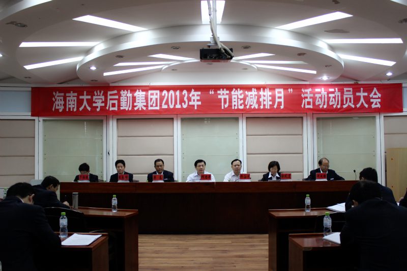 2013年4月11日上午9点,海南大学后勤集团2013年“节能减排月”活动动员大会在原行政办公楼一楼报告厅隆重召开。海南大学副校长何忠平、后勤管理处处长邢谷川、后勤集团总经理樊春、党委书记徐凤莲、副总经理李海清、李长明、许成强、总经理助理蒙生儒、徐小华及部级管理干部70余人参加了动员会。会议由后勤集团副总经理李海清主持。