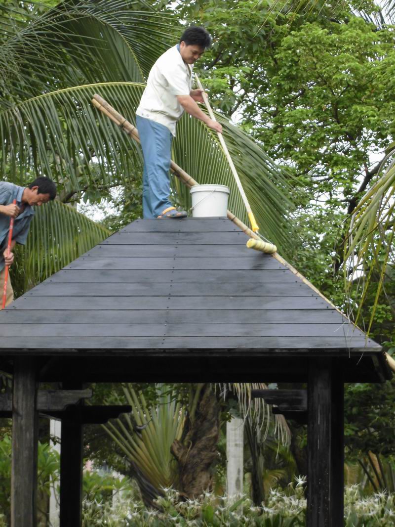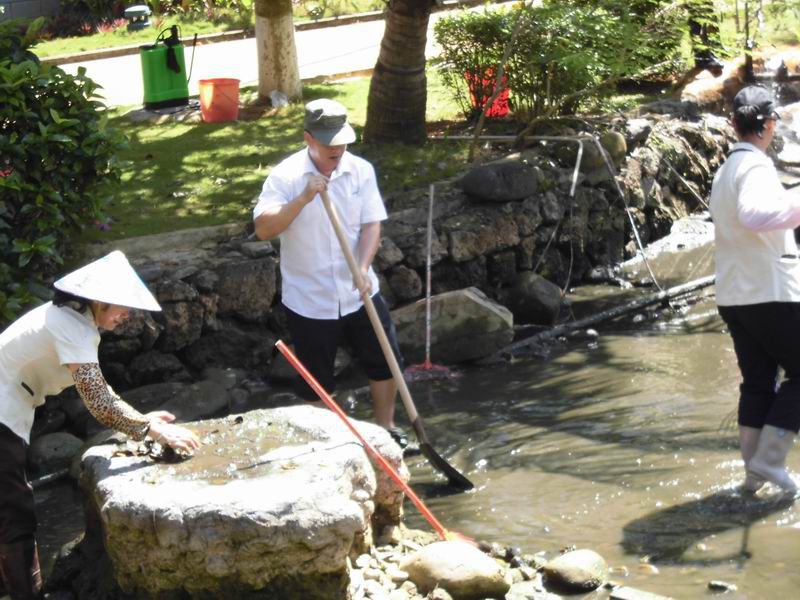 6月26日和28日,校园服务中心、旅院服务中心和工程中心联手对旅院中心花园进行整治和修缮。此次工作的重点是进一步清除花园内的杂草和枯枝败叶;对花园内小桥和凉亭进行保护性维修,重新用桐油上漆;清洗花园小湖;补种补栽花木从而达到尽快恢复原景观风貌的效果。