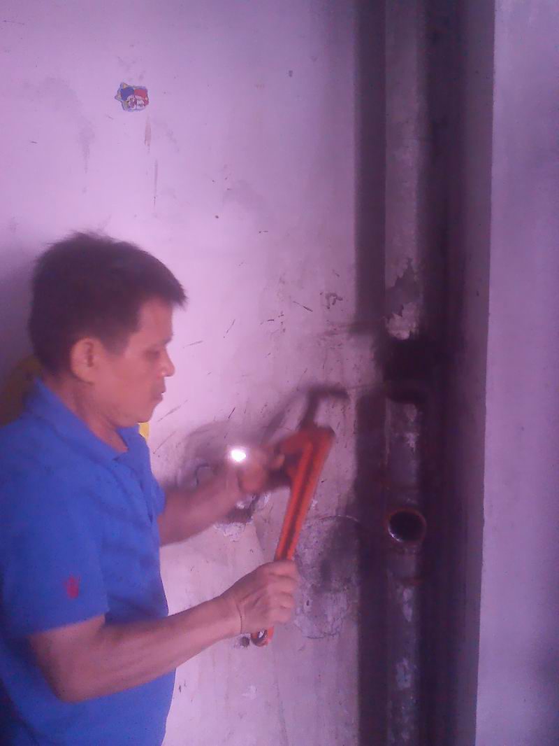 接到报修任务后,6月28日上午,工程中心维修服务部部长李少东带领朱广诚和韩江丰两位师傅来到3号学生宿舍楼,对一楼到六楼的消防水管联接情况进行细细检查后,决定对副楼101房的旧消防水管进行封闭。李少东部长先关掉该区域的总水闸,然后与朱广诚师傅和韩江丰师傅利用管钳、打磨机、锤子等工具将101房墙角的废旧消防水管切割拆除,并用止水阀将其封死。