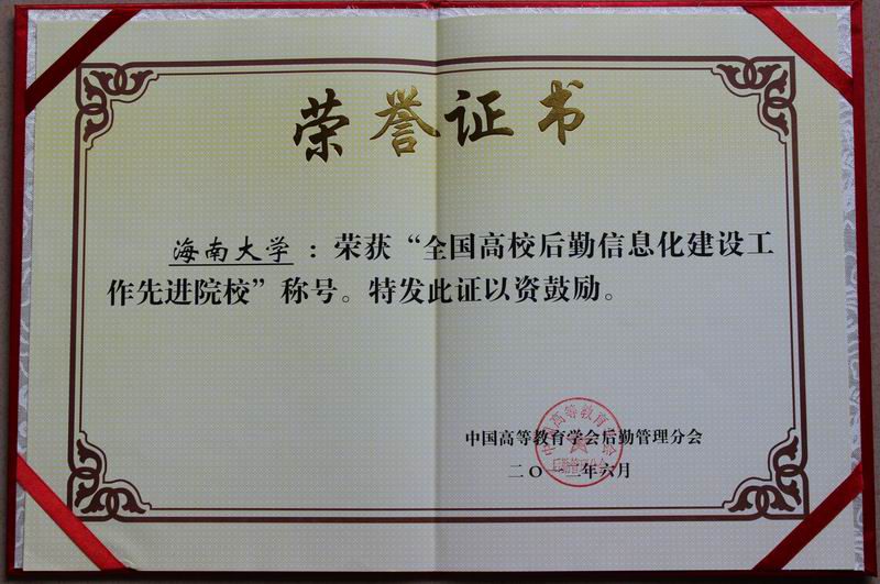 9月23日,由中国高等教育学会后勤管理分会开展的“全国高校后勤信息化建设先进院校表彰活动”在上海举行,海南大学获得“全国高校后勤信息化建设先进院校”。