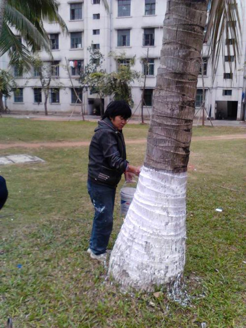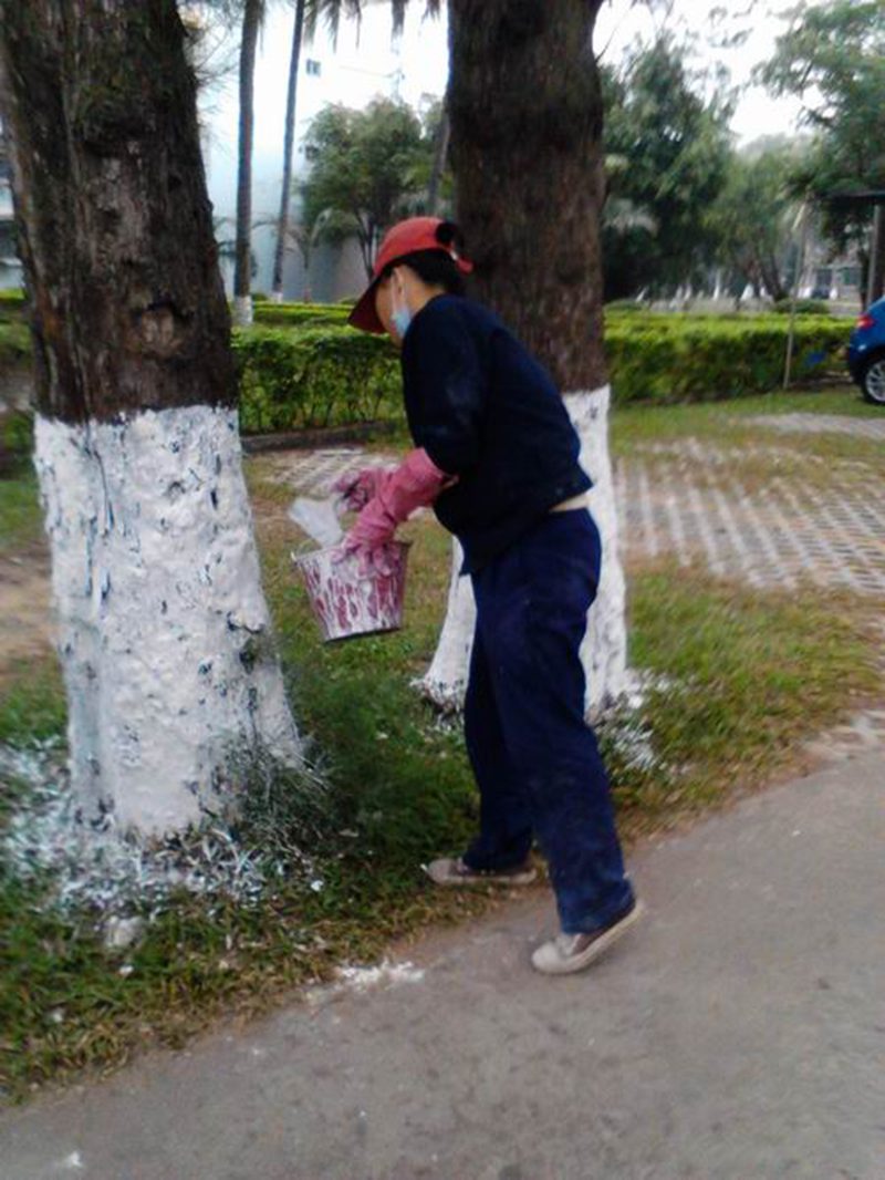 2012年元旦将至,为了营造良好的节日气氛,根据集团的工作安排, 12月27日上午,住宅区物业管理中心组织全体卫生工用石灰粉对辖区内校道两旁的树木以及停车场的树木进行粉刷,装饰树木为校园增添一道亮丽的风景线,迎接新一年的到来。