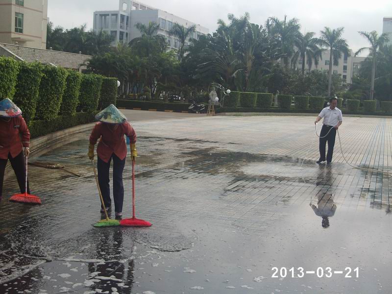旅游学院广场因前段时间持续雨天,西北边地面长期积水,污物沉淀瓷砖表面,3月20日上午,按照预先安排的计划,旅院服务中心主任陈国强率领清洁部人员来到广场,先用漂白粉和洗衣粉侵泡污水,半个小时后,干硬的污物被软化,清洁人员相互配合,用硬扫帚猛刷瓷砖,并用水细细冲洗,把瓷砖表面附着的乌黑脏物彻底清理干净。