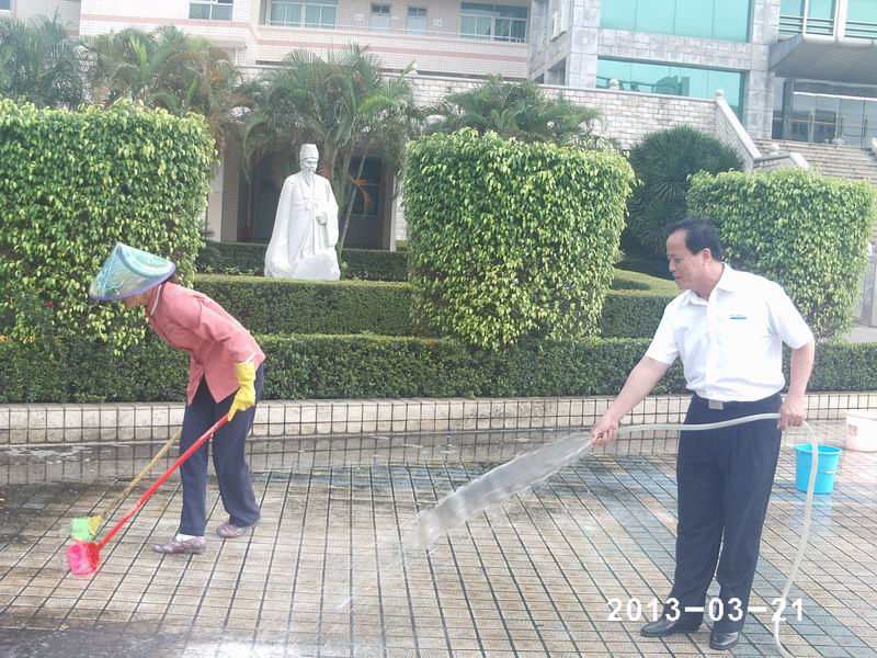 通过全体员工的努力清洗,还原了一个清净、整洁的广场,为学校迎接“211工程”建设省内验收画上了漂亮一笔。