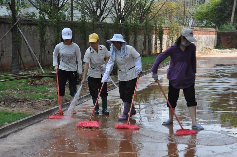 因阴雨天气影响,紫荆学生公寓楼绿地红泥伴随雨水流到路面,红泥等污物沉淀路面表面。为了快速还原道路本来面貌,工作人员先接自来水冲洗和浸泡路面,再用硬扫帚洗刷路面,把附在路面的红色脏泥彻底清理干净。