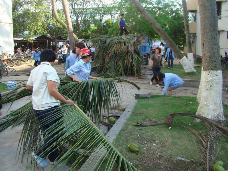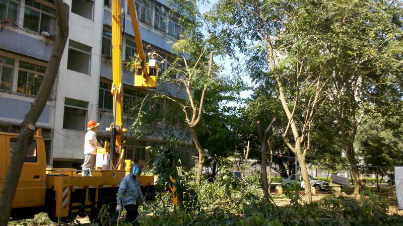教工住宅区由于有些树木多年没有修剪,树枝有的已伸展到住户的阳台、窗户,严重影响住户居室通风、透光。4月11日,校园服务中心副主任邓培亲自带队并操作高空作业车对教工住宅区72栋、66栋住宅楼高大印度紫檀进行了修剪。12日,校园服务中心组织人员在学生区4号、5号学生公寓楼门前修剪椰树枯叶、枯果,消除对学生造成的安全隐患。