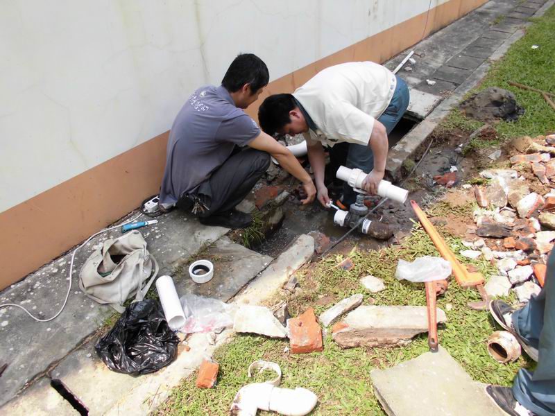 经对现场进行开挖检查后,确定是因铸铁管件腐烂导致,维修人员经商讨决定用pvc材料代替原来的铸铁材料后,学生区水电维修部立即派员购买材料,同时进行排水作业。当天气温高达37度,骄阳似火,这对长时间在户外作业的维修人员来说,非常辛苦;但是考虑到近千名学生的用水需求,他们争分夺秒进行抢修。水阀虽然已关闭,但水管内的余水以及原渗漏的水,无法全部排尽,在进行水管连接时,罗军成副部长只能站在没过小腿的污水中作业,经过四个小时的紧张抢修,终于在中午修复了水管,恢复了正常供水。