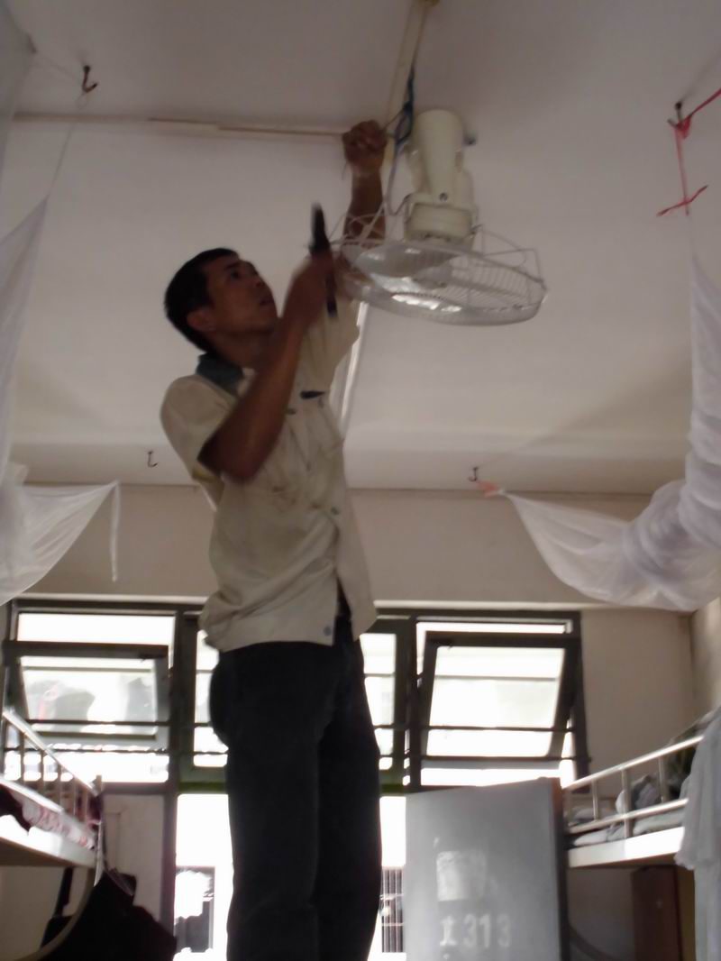 同去年相比,今年的风扇安装维修有几点不同:一、今年工期启动的时间早(去年是六月中旬份才开始),二 、安装维修数量多(去年安装新风扇270台,维修风扇100台;今年要安装风扇470台,维修风扇408台),三、维修人员少(去年全部门10名员工集体突击作业;今年为了不影响学生区其他的日常维修,抽出5名员工进行此项作业)。