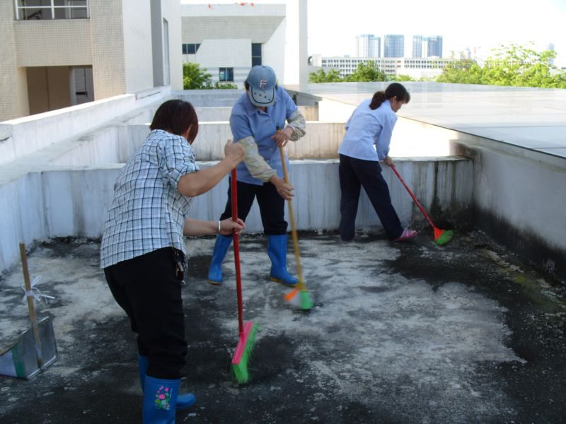 各教学楼全面检查教室门窗,用电设备,准备路面防滑标志等,发现问题及时处理。员工们全面清理水沟的淤泥,清扫沟边的残枝落叶,认真清理楼顶上的青苔、积土、落叶等杂物,保证楼顶排水顺畅。