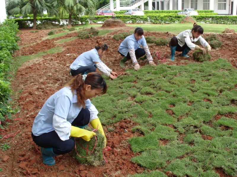 5月16日上午,教学区物业管理中心全体卫生工在单荣翠副主任的带领下对3号、4号教学楼周边绿化带的草皮进行大面积补植。整整一上午共种植草皮六百多平方米,为校园增添了一片绿色。