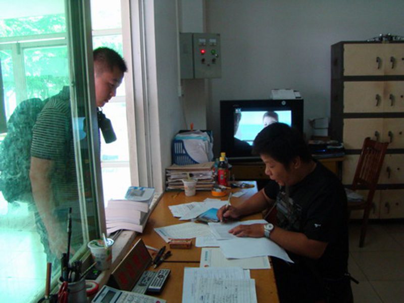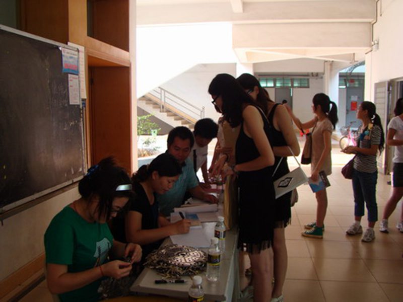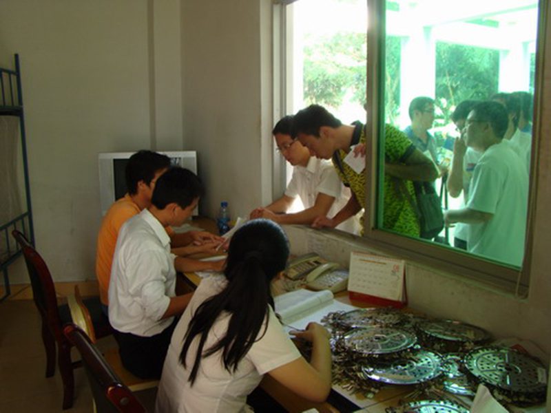 10号公寓楼工作人员正在为2011级研究生办理入住手续