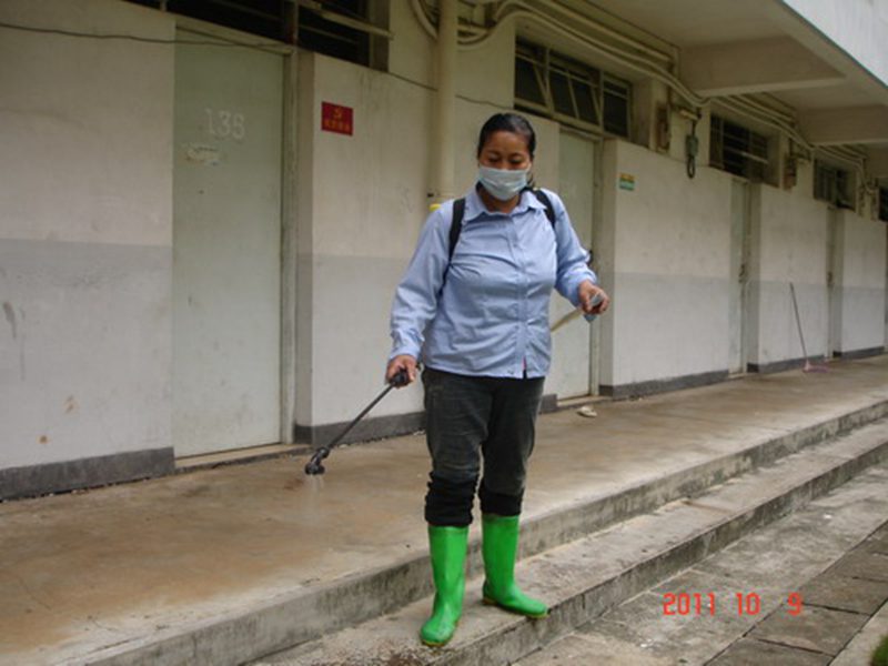 在消毒工作现场,李丽霞副主任自亲带队指导消毒工作,按集团要求,使用氯消净消毒粉按比例配剂,主要对学生公寓宿舍楼的厕所、洗澡间、排水沟、化粪池、走廊、楼梯、扶手、大厅和值班室等公共区域和部位进行消毒,每天消毒两次。