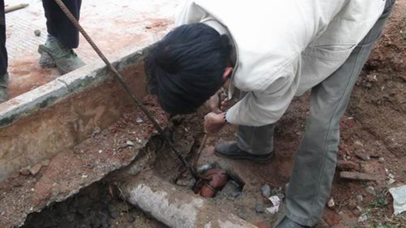12月2日,有关人员在李主任的带领下,决定对14号学生公寓排污管道进行开挖排查,经过1个多小时的开挖,打开埋在地下1米多的管道,结果发现管道接口处有一篮球正好堵住管道,堵得非常严紧,在大家的努力下,取出篮球,污水哗啦啦地排了20多分钟,各个排污井及管道一下子恢复到顺畅的排污状态,排污疏通成功,困扰14号学生公寓楼2年多时间的排污难题终于解决了。