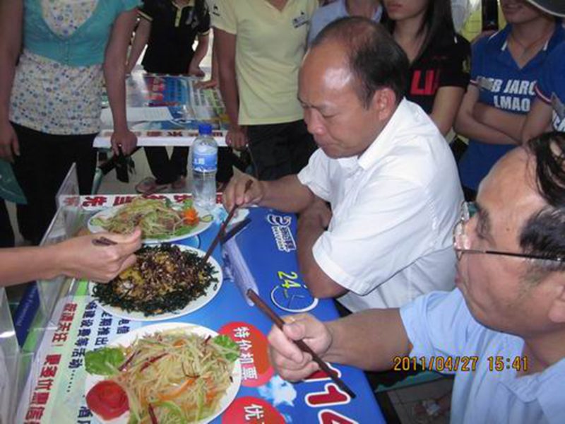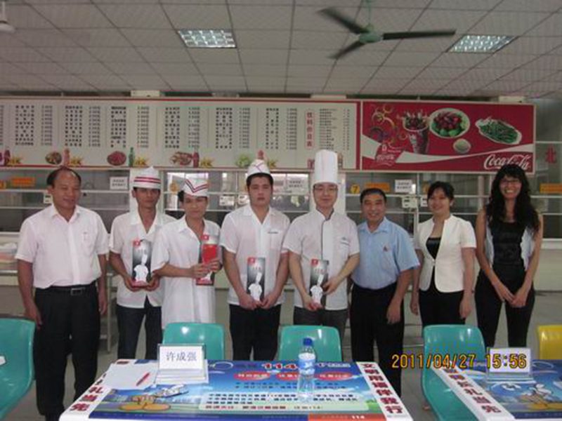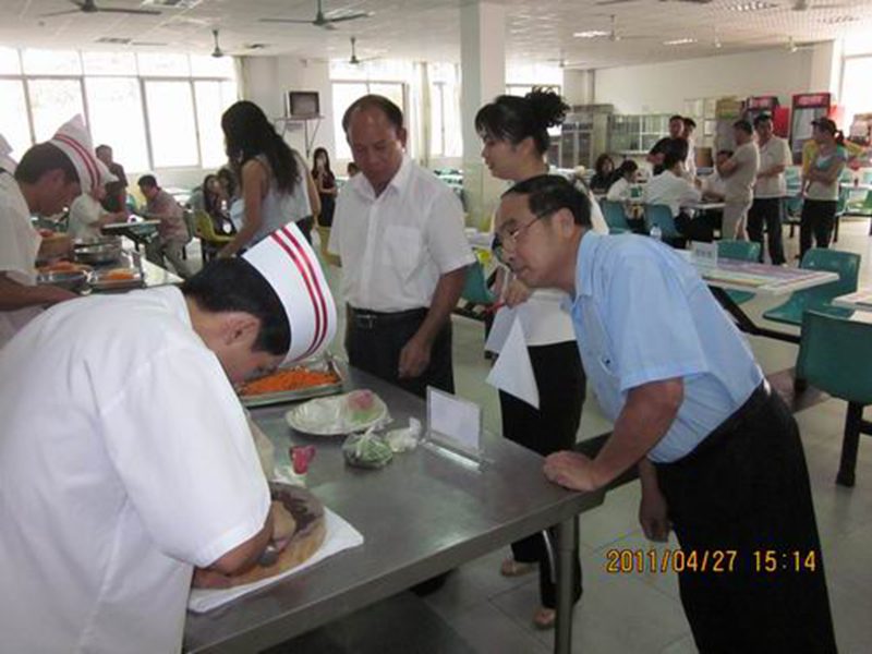 为进一步提高食堂厨师刀工技术,加强厨师间的交流。2011年4月27日下午,旅院服务中心精心组织了一场“金刀手”竞技比赛 第七食堂第一餐厅杨其林同志、第二餐厅胡诗强同志、第三餐厅(中餐)吴旭同志、第三餐厅(面食)吴坤杰同志等4名厨师同场竞逐 “金刀手”。本次比赛邀请校后勤处综合科郑传宽科长、后勤集团许成强副总经理、质量与文化办公室办何秀敏副主任和饮食服务中心王娇副主任担任评委。