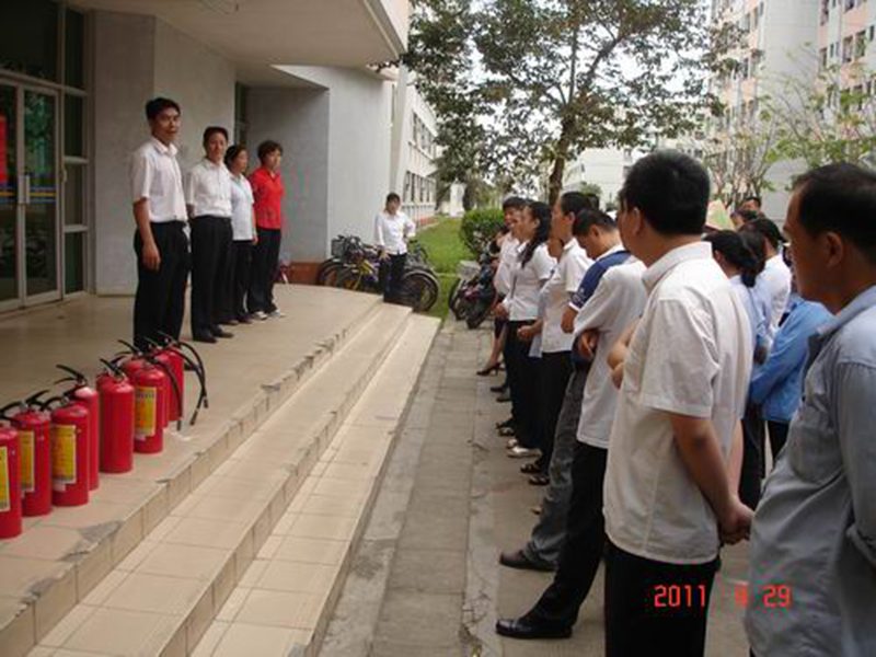 在演练现场,首先,由王托副主任讲解ABC手提式干粉灭火器的使用方法以及灭火注意事项,并进行灭火演练示范。接着,各楼管理员和卫生工都进行了实地演练,体会消防灭火。