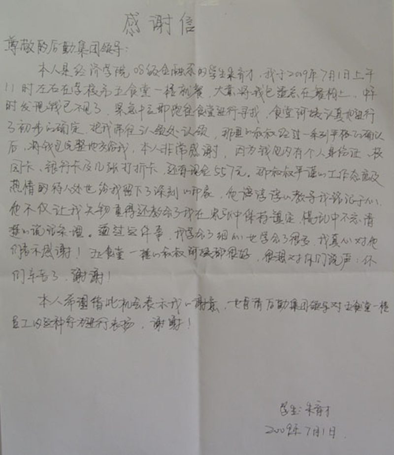 7月6日,饮食服务中心收到我校经济学院08级金融系朱育才同学的一封感谢信。朱育才同学的来信既表达了一位普通同学的感谢心意,也是对后勤员工服务的肯定,更是对后勤工作的鞭策和激励。值此之际,感谢广大同学对后勤服务工作的理解和支持,今后,我们奖不断提高管理水平和服务质量,为大家做好后勤服务保障工作。