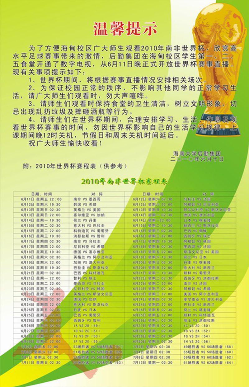 后勤集团在此温馨提示:1、世界杯期间,将根据赛事直播情况安排相关场次。2、为保证校园正常的秩序,不影响其他同学的正常学习生活,请广大师生们观看时,勿大声喧哗。3、请师生们观看时保持食堂的卫生清洁,树立文明形象,切忌出现乱扔垃圾及摔砸酒瓶等行为。4、请师生们在世界杯期间,合理安排学习、生活、作息及观看世界杯赛事的时间,勿因世界杯影响自己的生活学习规律。上课期间晚12时关机,节假日和周末,关机时间延后。