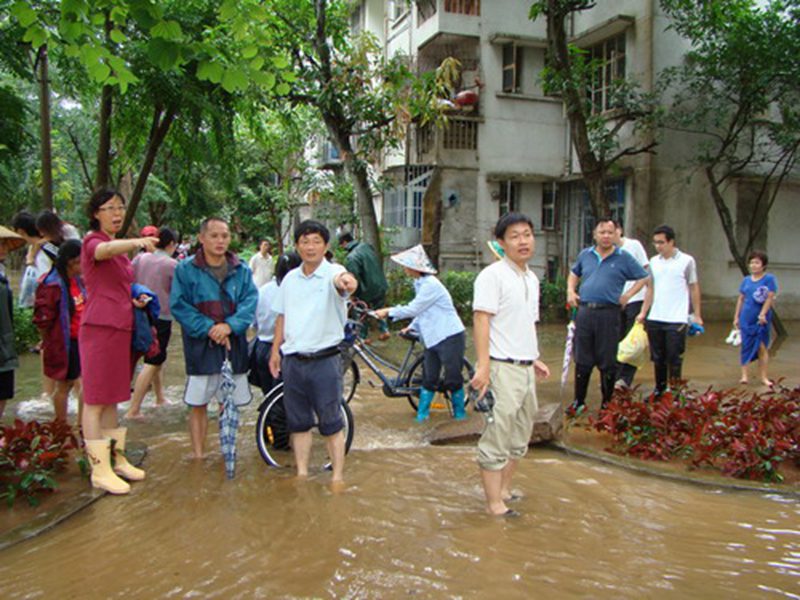 10月8日早,连续暴雨使校园变为水乡泽国,多处重要路段积水严重,严重影响交通的路段有:云翮路、流芳路、致远北路、群贤中路、海韵中路、海韵东路、旅游学院、校中门、住宅区新八栋草坪、玉兰路、芙蓉路、57和58栋教工宿舍楼等,因积水面积广,短时间降水量大,再加上排水速度慢,致使这些地方积水深及膝盖,过往的师生员工都光着脚,挽高裤脚,拎着鞋子缓慢行进,过往的车辆趟水通过时溅起一排排水花,甚至出现车辆在水中熄火。