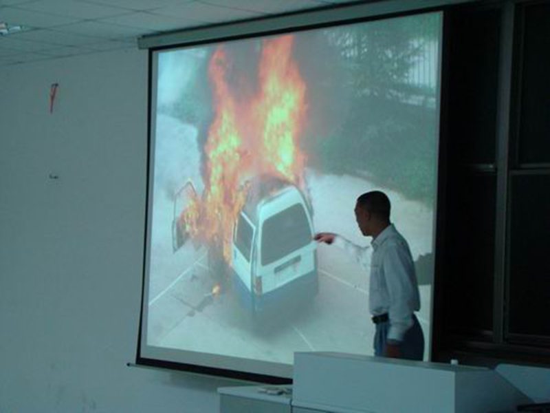 周老师结合图片展示的方式讲解了火灾逃生知识、家庭办公用电安全、火灾隐患排查、汽车火灾急救知识及消防器材的使用方法等。如家庭防火措施方面,应配备干粉灭火器、手电筒、绳子、热感应器、燃气感应器等。干粉型灭火器的使用方法:“一看(看灭火器上的压力表是否正常)、二拔(拔开保险杆)、三瞄(瞄准火势的根部)、四压(压下手闸)”。