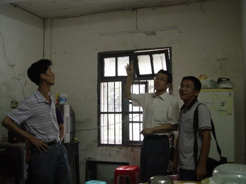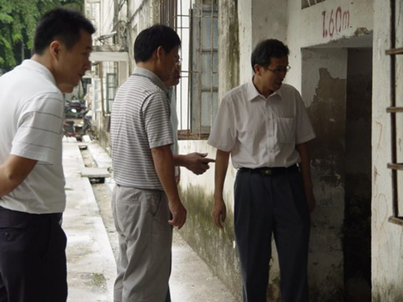 因受到近期的暴雨袭击,加上今年第13号台风“鲇鱼”可能来袭,年久的房子是否存在安全隐患,能否继续住人,对此情况曹献坤副校长特别关注。20日下午,学校多部门邀请土木工程学院的李光范教授来到海甸校区教工区57、58栋进行实地勘察。