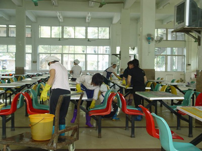 26日上午8点左右,由各食堂主任率领各自的员工开始对各餐厅内的桌椅、电风扇、售饭台,操作间的菜架、菜框、冷藏柜、厨餐具进行了一次大清洗,笔者在餐厅现场看到,抹桌椅,冲地板,擦风扇、门窗,洗菜框、餐盘……不少男员工赤膊上阵,汗流浃背,有的员工弄得油污满身也不顾。