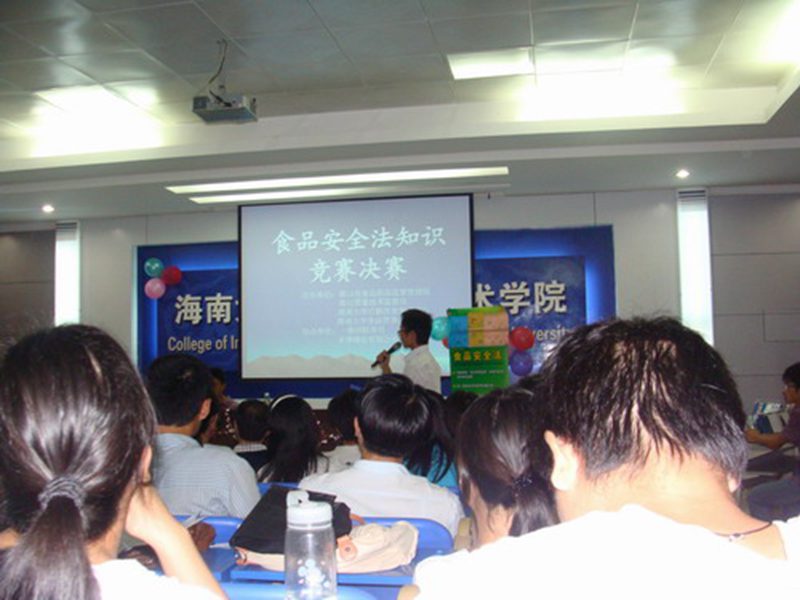 为保障我校师生的身体健康及生命安全,2010年5月15日,海南大学后勤集团饮食服务中心与海南大学食品营养协会共同举办食品安全法知识竞赛。海口市食品药品监督管理局吴银华副局长,海口市质量技术监督局陈长调研员,海口市质量技术监督局食品处卢慧处长及海南大学后勤集团饮食服务中心周经日主任,海南大学食品营养协会指导老师段振华教授出席比赛。