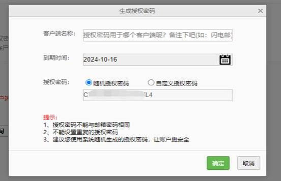 提示:一个授权码对应一个客户端,如同时使用多个客户端,请为每个客户端配置专属授权码、且均不与邮箱密码相同的授权密码。