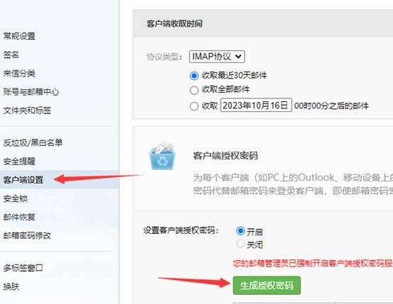 三、如图所示,协议类型选择IMAP协议、收取最近30天邮件。设置客户端授权码选中“开启”,点击“生成授权密码”按钮。