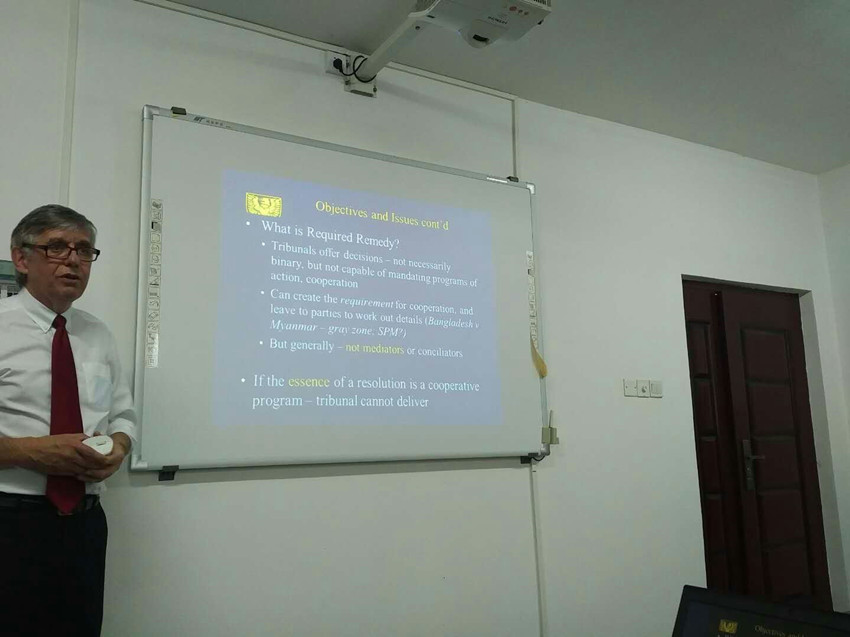11月10日下午3点30分,加拿大Dalhousie大学法学院的前任院长Philip Saunders教授来本院演讲,加拿大Dalhousie大学是加拿大的海洋法研究重镇,也是本院特聘院长高之国法官的母校。Philip Saunders教授为加拿大最具权威的国际海洋法学者,也曾经受托在国际法院担任律师,学术修养与实务经验兼具。Philip Saunders教授演讲的题目是“1982年联合国海洋法公约的争端解决机制,兼论中菲南海仲裁案裁决蕴含的法律问题”。在2个小时的演讲中,他阐述南海仲裁案的管辖权裁决如何违反海洋法公约的相关条文。深入浅出,包罗万象。让师生受益匪浅。