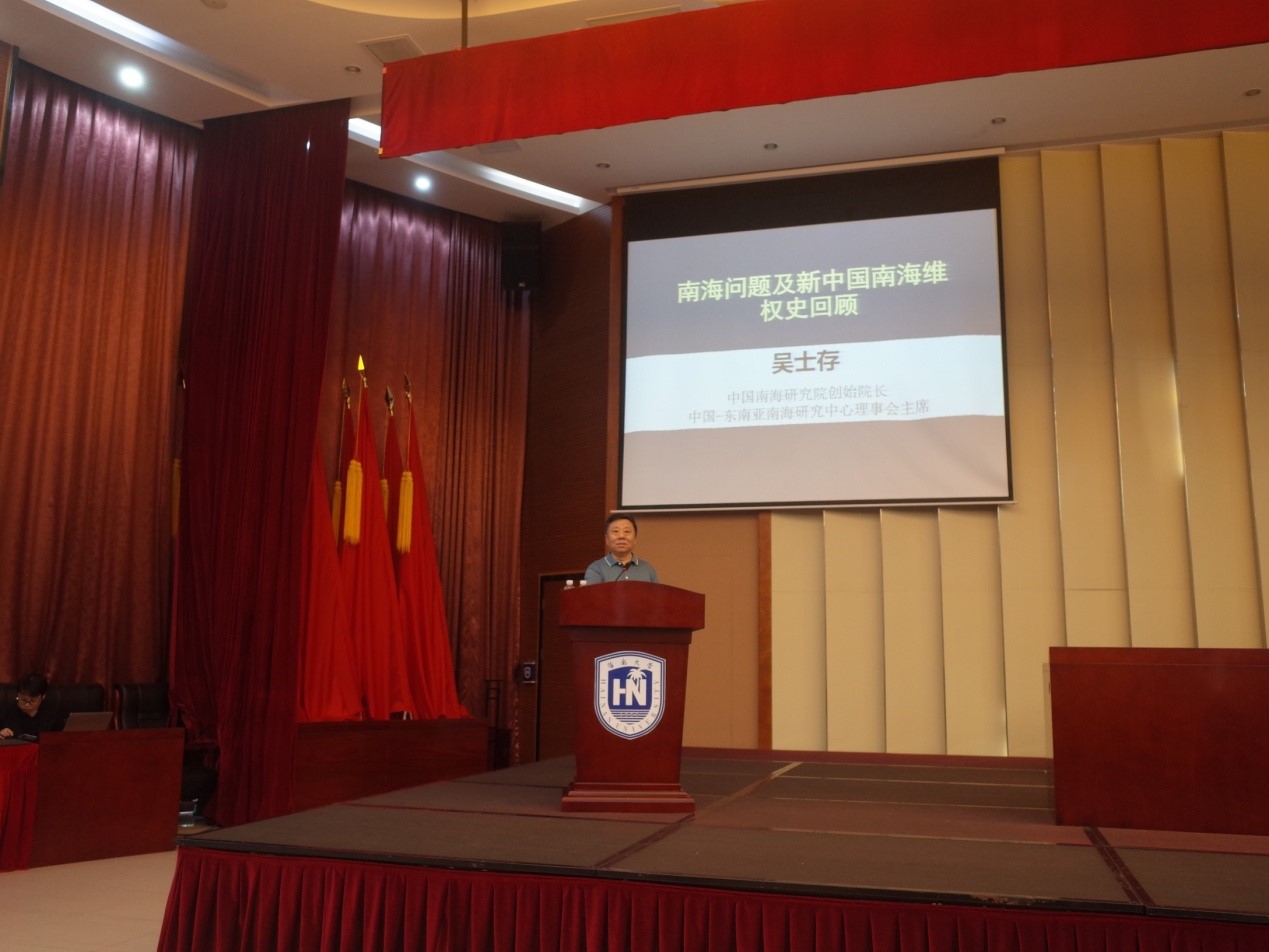 南海是连接两洋三大洲最便捷的水道和全球最繁忙的重要航运通道之一,同时又面临诸多传统、非传统安全挑战。海南地处南海前沿,是国家实施改革开放国家战略和推进海洋强国建设的前沿。十八大以来,党中央做出建设海洋强国的重大战略部署,并提出把南海建成以“和平之海、友谊之海、合作之海”的目标。为进一步帮助同学们更加精准的把握当前南海局势和未来南海形势的走向,10月19日下午,海南大学第24期形势与政策时事论坛在社科楼二楼报告厅举办。中国南海研究院创始院长吴士存受邀为海南大学师生作主题为《南海问题及新中国南海维权史回顾》的专题报告,学校“形势与政策”授课老师及部分学生参加报告会活动。会议由海南大学马克思主义学院院长张云阁主持,由海南大学党委常委、宣传部部长谭勇作总结。