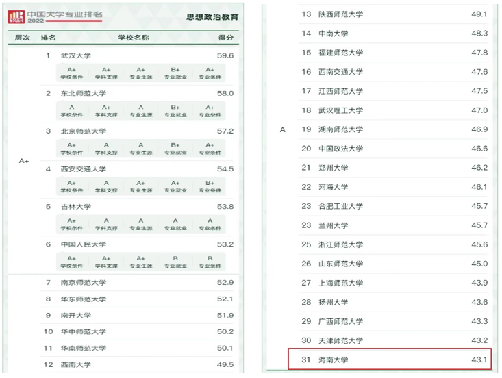 6月18日,高等教育专业评价机构软科今日正式发布2022“软科中国大学专业排名”,在2022年中国软科中国最好专业排名中,海南大学马克思主义学院思想政治教育本科专业以31名进入全国思政本科专业类A类。