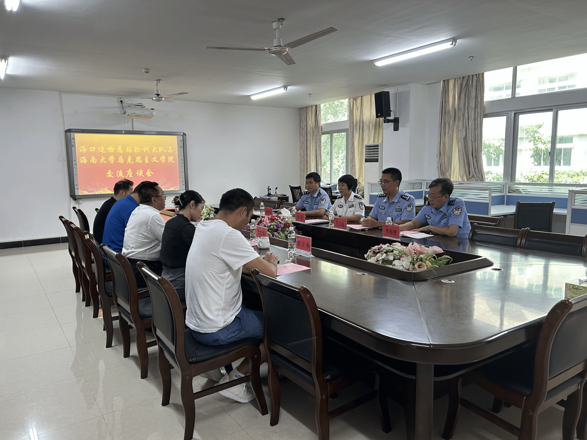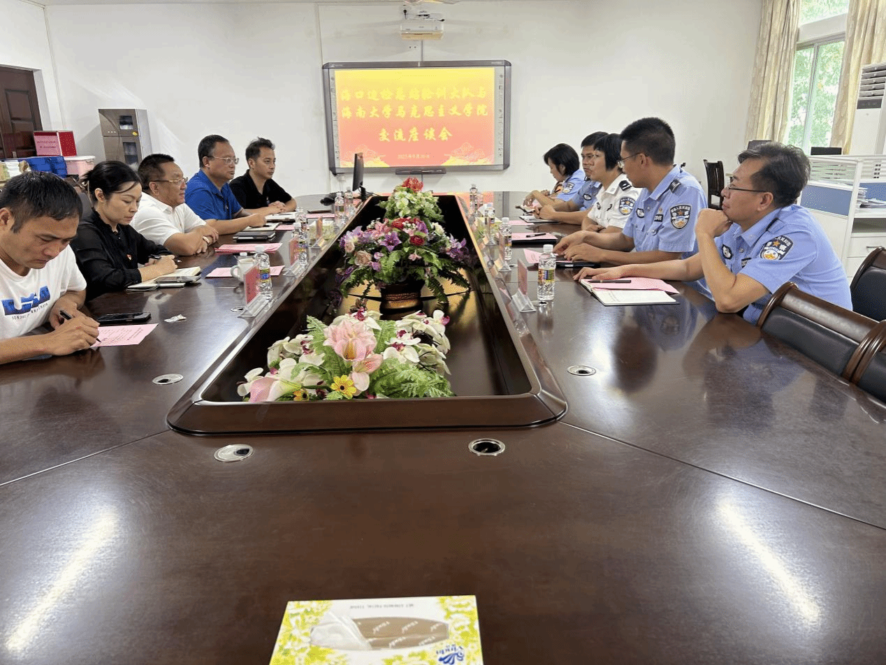2023年9月20日海口边检总站轮训大队与海南大学马克思主义学院在社科楼A311会议举行交流座谈会,海口边检总站轮训大队大队长刘瑛、副大队长吴镇波、处长程桂东、教员李海波和陈蕾出席座谈会,马克思主义学院部分领导班子成员和科室主任参加会议,会议由学院党委书记段捷频主持。