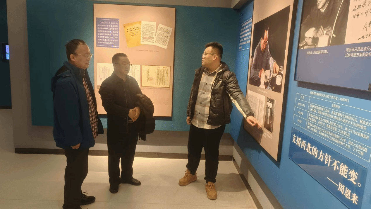 调研组与西安交通大学马克思主义学院同行举行座谈,西安交通大学马克思主义学院党委书记苏玉波主持座谈会并就党建工作进行介绍,院长燕连福从历史沿革、学科建设、服务地方等方面介绍了西安交通大学马克思主义学院的办学情况,并重点介绍了“西迁精神”融入思想政治理论课的相关经验,副院长陈建兵、梁军,我院校友、西安交通大学马克思主义学院高飞老师出席座谈会并带领调研组参观了交大西迁博物馆。