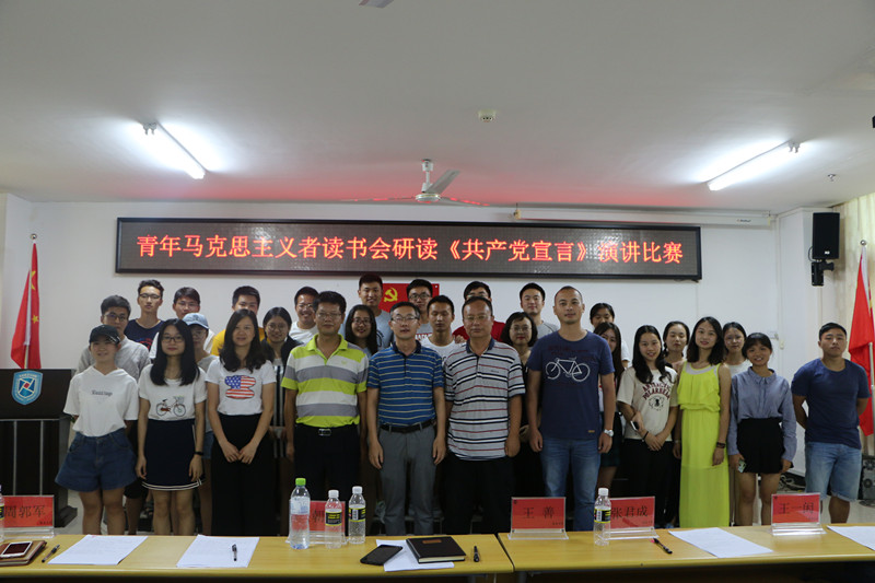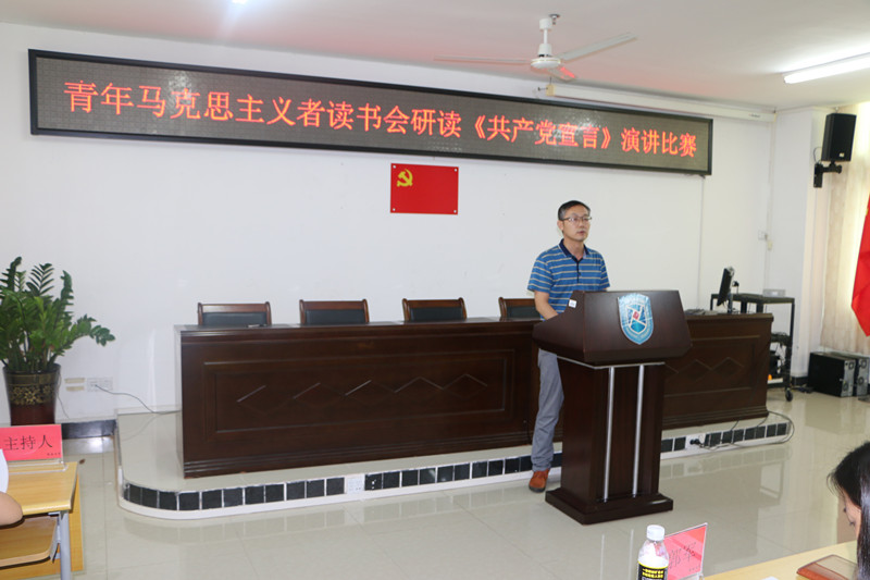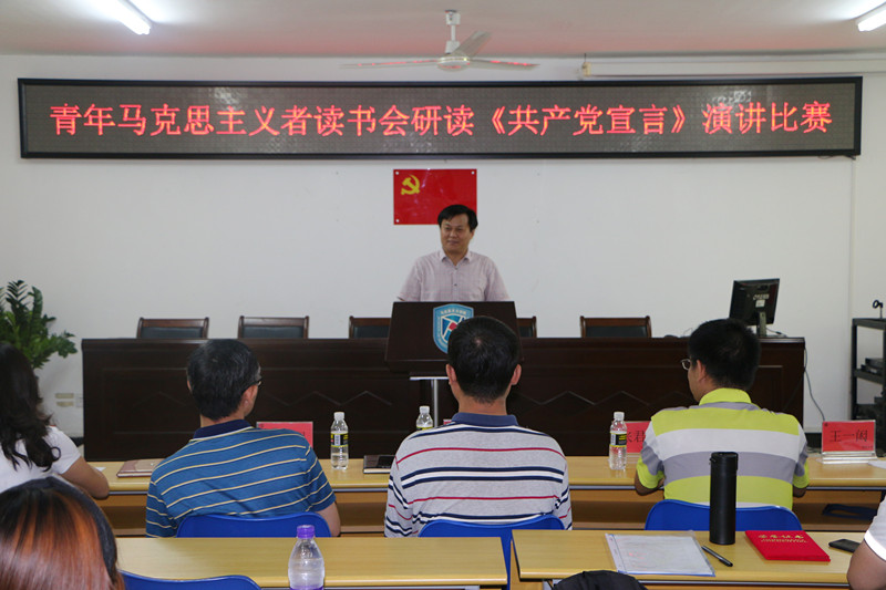 为纪念《共产党宣言》发表170周年,促进广大同学深刻感悟和把握马克思主义真理力量,提升马克思主义理论素养和语言表达能力,马克思主义学院青年马克思主义者读书会以重温《共产党宣言》为主题组织研读原著、撰写心得、公开演讲系列活动。5月12日下午,研读《共产党宣言》演讲比赛在社科楼A315隆重举行。马克思主义学院院长李辽宁出席活动并讲话,教务处副处长吴朝阳、马克思主义学院副院长王善、马克思主义学院教师王一闳、张君成、周郭军担任比赛评委。