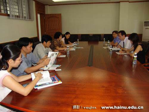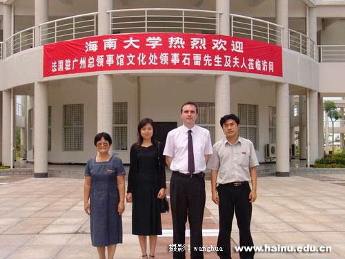 随后,石雷领事与我校外国语学院院长曹玲娟教授、旅游学院副院长杜文才博士、法学院院长童光政教授举行了座谈。石雷领事首先向在座的人员颁发了留学法国的最新资料,并介绍了此行来访的目的,即邀请我校负责人参加10月下旬在广州举办的法国留学推介会,同时了解我校与法国高等院校间开展合作交流的情况,并将有关资助的项目纳入2005年法国大使馆的经费预算。外国语学院院长曹玲娟教授、旅游学院副院长杜文才博士、法学院院长童光政教授分别介绍了学院的基本情况,表达了与法国高校在法语、旅游、法律等方面合作的愿望。曹玲娟教授表示,希望大使馆提供帮助,在我校设立美欧研究中心,并以此为桥梁加强对西方文化的研究;杜文才博士表示,希望与法国的一些著名院校组织关于旅游设施的主题研讨会,并以此为契机,加强我校与国外旅游界的合作;童光政教授提出,希望与法国同行相互交流,特别是关于《法国民法》及《拿破仑法典》方面的法律信息。