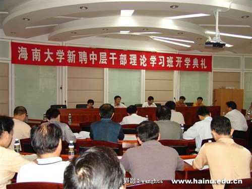 海南大学新聘中层干部理论学习班开学典礼于8月31日下午在办公楼一楼报告厅举行。典礼由校党委书记赵康太教授主持,参加典礼的校领导有校长谭世贵教授、副校长符华儿研究员、副校长严庆副教授、副校长史贻云教授。参加学习班的学员为全校的中层干部,同时还特邀校各民主党派负责人参加。典礼上,组织部部长丁赛珠同志宣读了校党委关于理论学习班的有关文件;赵康太书记对参加学习的全体学员提出了严格要求,希望大家通过学习提高自身素质和能力,严以律已,廉洁勤政,为实现我校的发展目标做出贡献。
