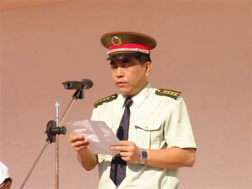 9月6日上午,我校2004级新生开学典礼暨军训动员大会在第一田径运动场隆重举行。参加大会的领导和来宾主要有海口警备区司令员符永健大校,海南省军区朱明江中校,海南省教育厅体育卫生艺术教育处处长王夏鸥同志,海口市美兰区人民武装部部长刘慧义上校,海南省边防局王录坚中校,海南省军区陈秀旺上尉,海南省军区陈光清上尉,海口市美兰区人民武装部朱力生少校。参加大会的校领导有校党委书记赵康太教授,校长谭世贵教授,副校长符华儿研究员,副校长严庆副教授,副校长林强教授,副校长史贻云教授,以及各职能部门、各学院负责人,参加大会的还有教师代表及新生共4000多人。大会由副校长严庆副教授主持。