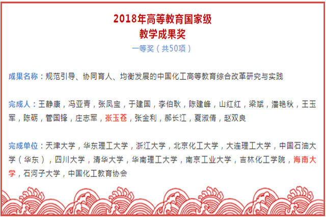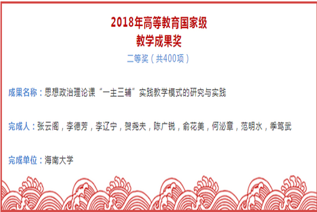 近日,教育部公布了关于批准2018年国家级教学成果奖获奖项目的决定(教师〔2018〕21号)。高等教育国家级教学成果奖452项,其中,特等奖2项,一等奖50项,二等奖400项。海南大学参与完成的项目“规范引导、协同育人、均衡发展的中国化工高等教育综合改革研究与实践”荣获一等奖(该项目是在教育部高等学校化工类专业教学指导委员会的领导下,由天津大学牵头,联合国内化工优势学科高校开展的化工专业建设指导规范研究工作)。海南大学“思想政治理论课‘一主三辅’实践教学模式的研究与实践”项目名列其中,荣获二等奖。