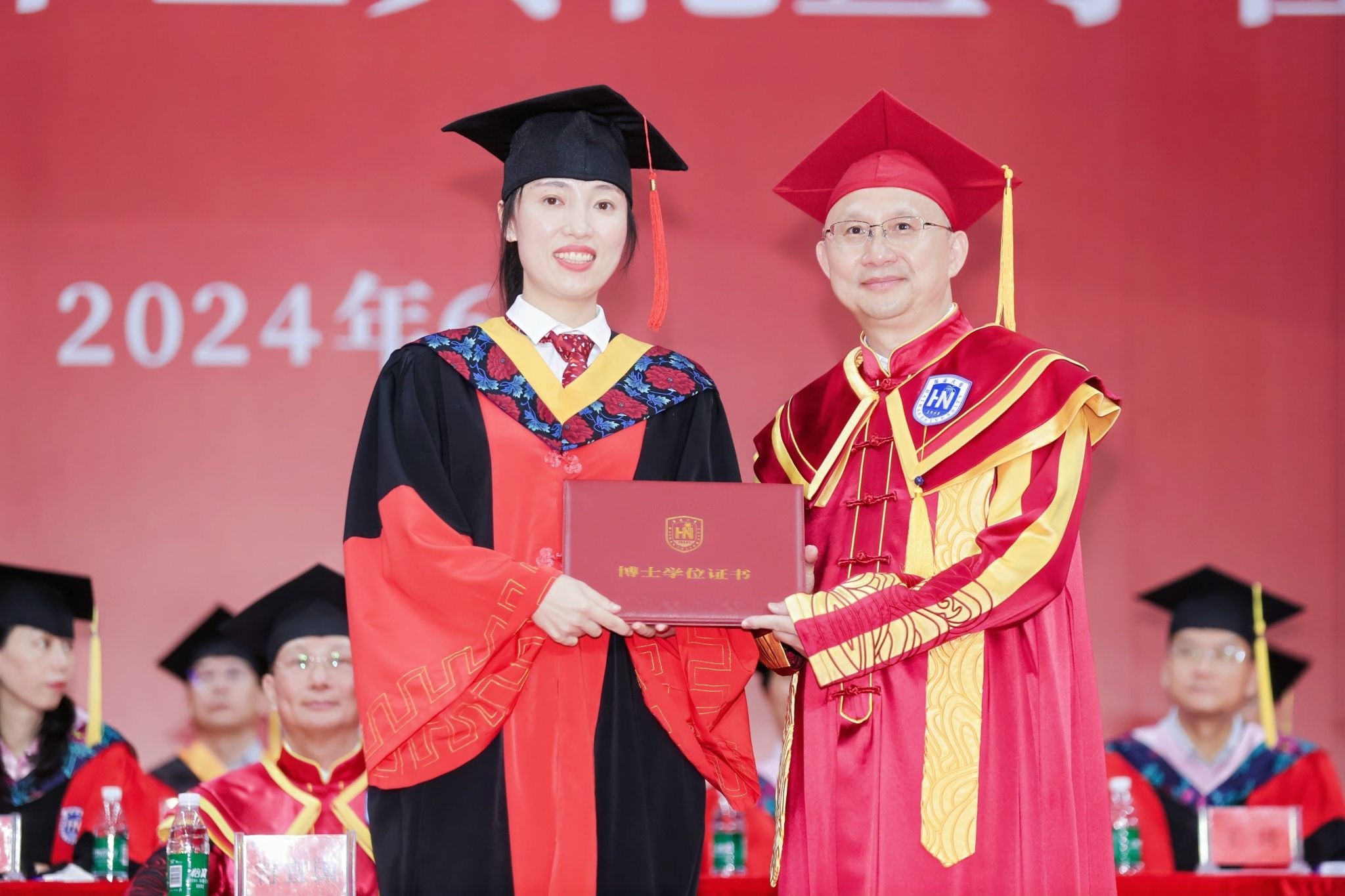 6月23日上午,骆清铭在海南大学2024年毕业典礼暨学位授予仪式上为博士毕业生授予学位并颁发证书。 宣传部 摄