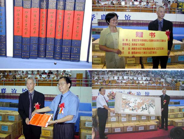 2002年6月18日下午,香港汉荣书局有限公司董事总经理石汉基先生向海南省九所高校赠书仪式在我校联谊馆举行。仪式由省教育厅徐金龙副厅长主持。出席大会的领导和嘉宾有国家教育部副部长韦钰院士,海南省副省长王厚宏,省人大常委会副主任吴葵光,省政协副主席符气浩、陈家悦,省教育厅和海南大学全体领导及有关处办人员以及海南省9所高校有关领导。
