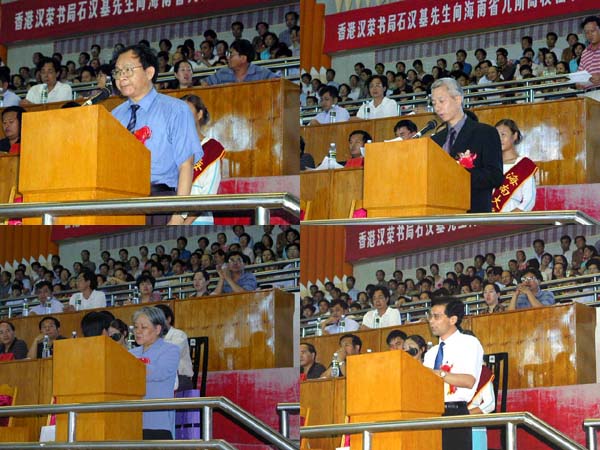 石汉基先生在赠书仪式上怀着十分激动的心情代表其父亲石景宜博士及全家人对出席仪式的领导和嘉宾表示崇高的敬意和感谢!石景宜先生二十多年来为祖国“四化”建设,为推动海峡两岸的文化交流,促使祖国和平统一事业,将全部精力与心血奉献给了祖国的文化教育事业,因而享有“文化书使”的美誉。石汉基先生继承父业,从1986年至今赠书已达110万册,这一次向海南省9所高校赠送价值140多万元的书籍。我校谭世贵校长代表海南省9所受赠单位发表了鼓舞人心的讲话,对石汉基夫妇的热情壮举表示衷心感谢!同时表明了在石先生这种精神的推动下和各级领导的关怀支持下,海南的教育事业近几年将有一个飞跃,尤其我们海南大学将从质到量上会有明显的档次提升,将为海南的建设发展作出应有的贡献。